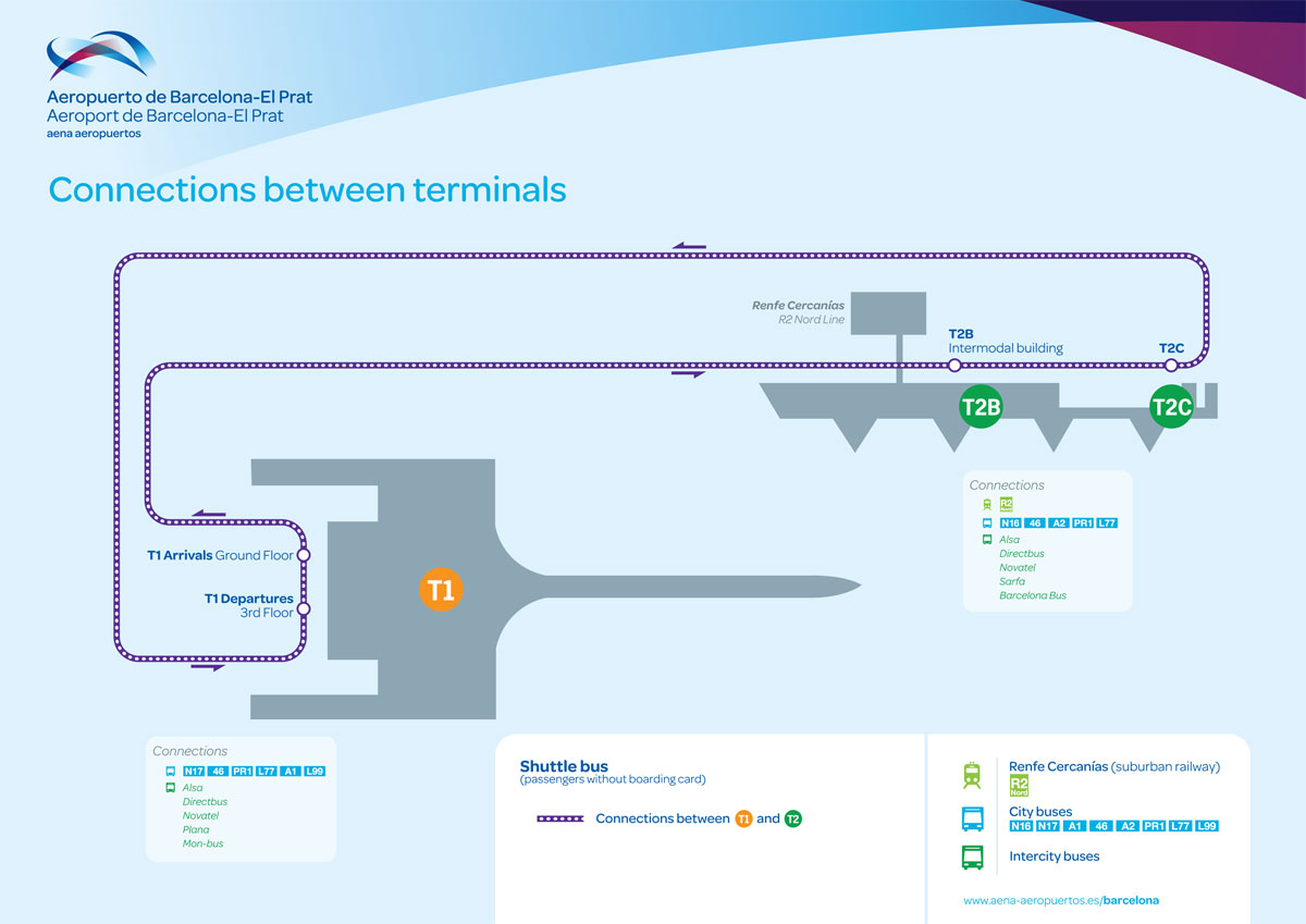 Der Flughafen Barcelona besteht aus den zwei Terminals T1 und T2. Zwischen diesen beiden Terminals verkehrt ein kostenloser Bus-Shuttle, der immer im Kreis fährt (falsch einsteigen ist unmöglich). Der Bahnhof liegt gegenüber vom Terminal 2, Abschnitt B.